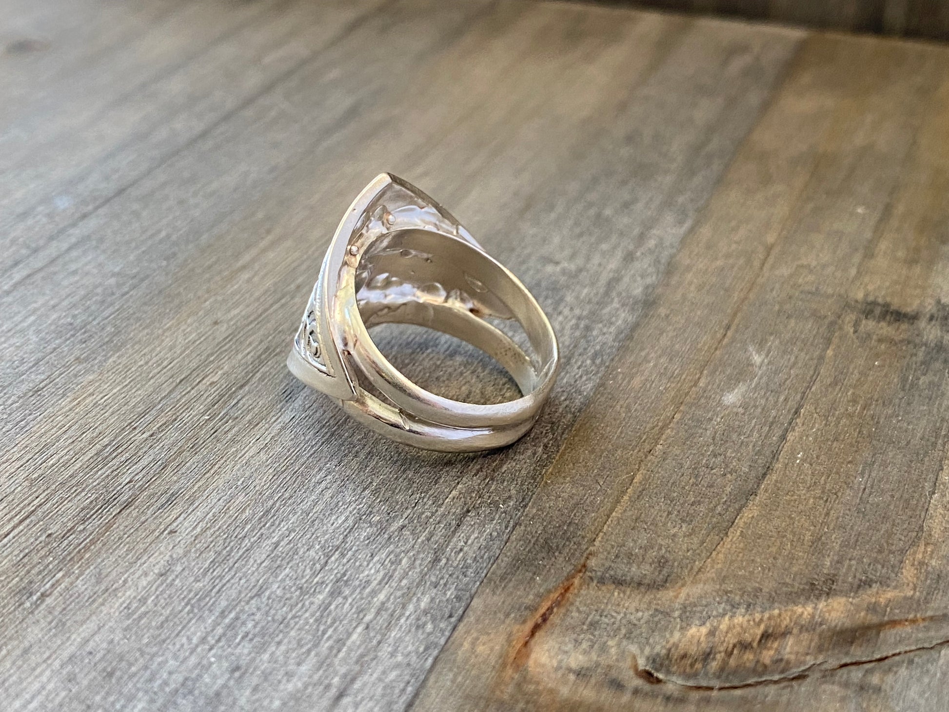 Hand crafted in wax and cast in Solid Sterling silver so this design is very unique to this ring.